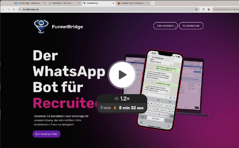 In dieser Anleitung wird der WhatsApp Bot startklar gemacht. Hierfür wird im FunnelBridge Kundenbereich sowohl die Verbindung zu Ihrer Recruitee Seite als auch zu Ihrer WhatsApp Cloud API hergestellt.